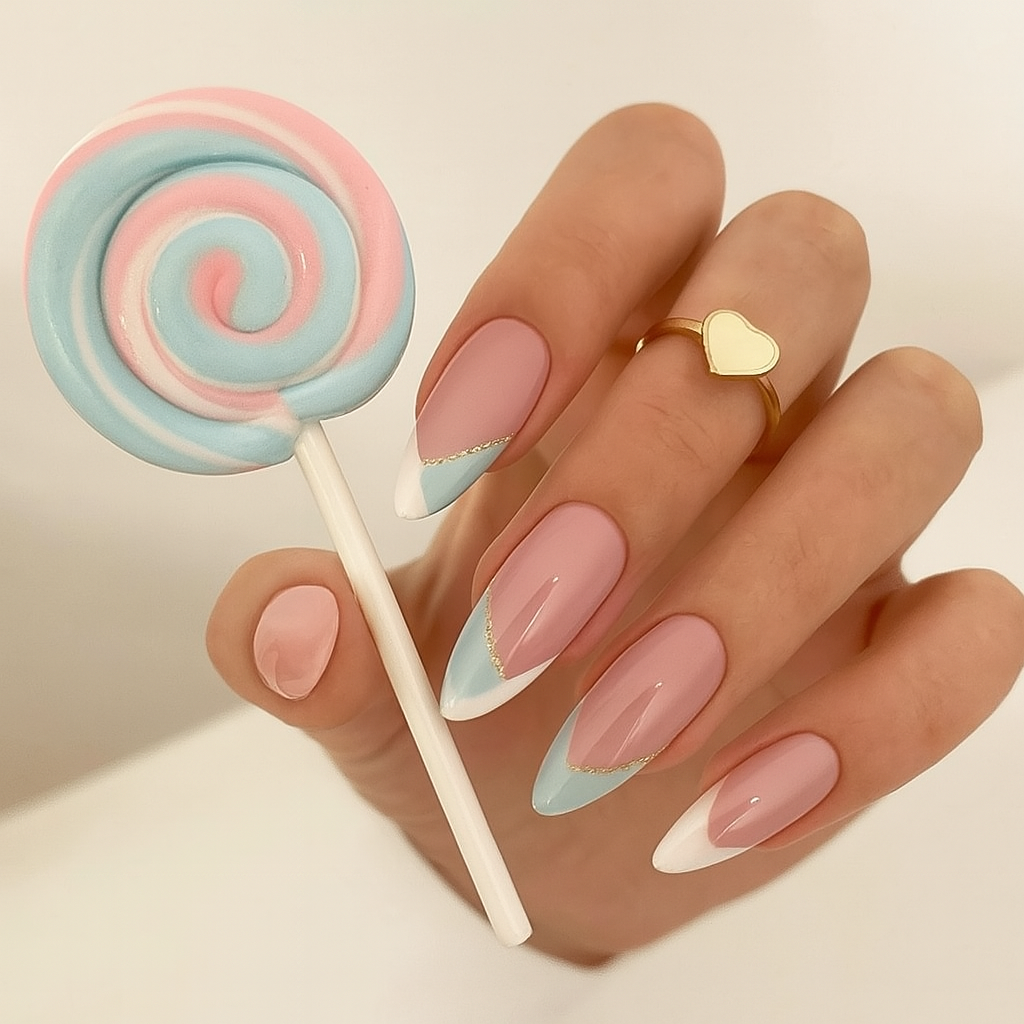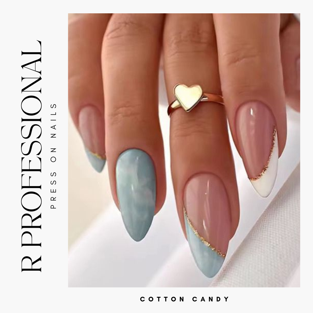 Channel dreamy pastels and playful vibes with Cotton Candy, a soft yet stylish blend of baby blue and blush pink with white and gold accents. Whether you’re stepping out for brunch or floating through a spring afternoon, these nails add a touch of sweet sophistication to every look.